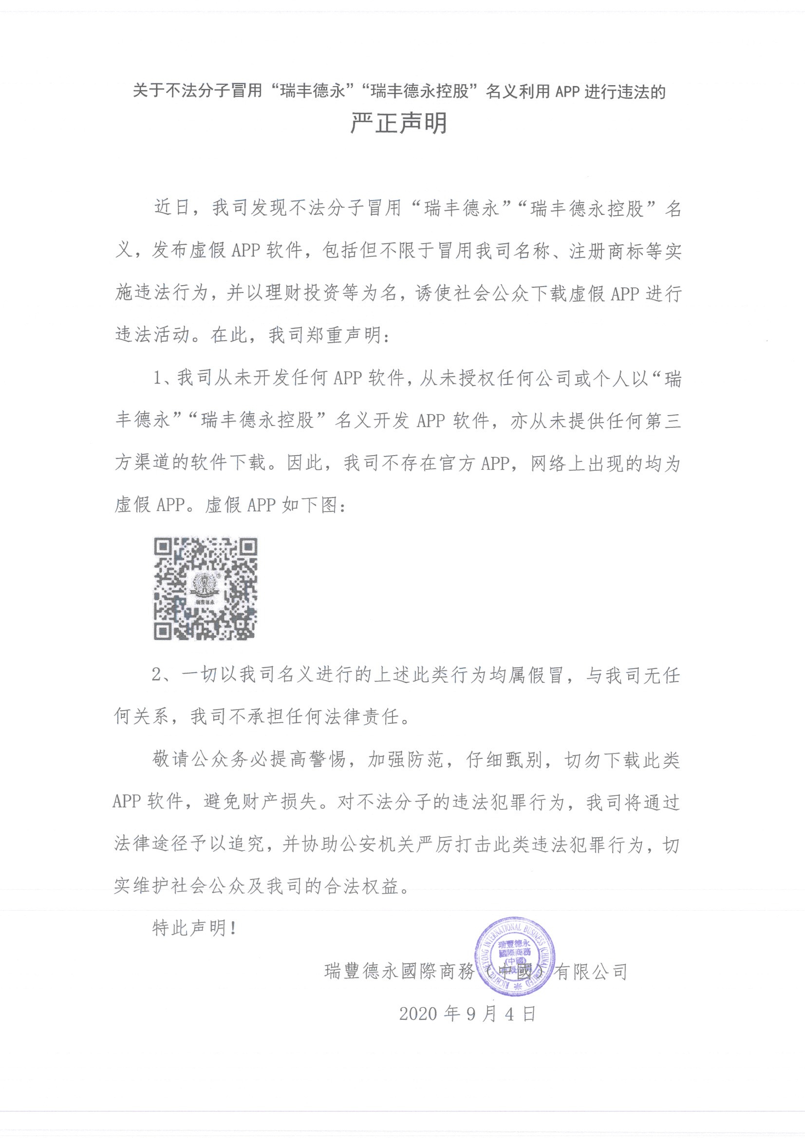 近日,我司發(fā)現(xiàn)不法分子冒用“瑞豐德永”“瑞豐德永控股”名義,發(fā)布虛假APP軟件,包括但不限于冒用我司名稱、注冊(cè)商標(biāo)等實(shí)施違法行為,并以理財(cái)投資等為名,誘使社會(huì)公眾下載虛假APP進(jìn)行違法活動(dòng)。在此,我司鄭重聲明: