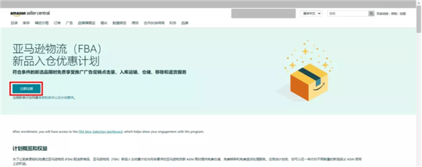 (1)登陸亞馬遜賣家平臺,訪問該計劃活動頁,點擊頁面中的“立即注冊”按鈕,即可加入該計劃。您發送商品到亞馬遜運營中心之前,必須先注冊該計劃,才有機會享受計劃中的費用優惠。
