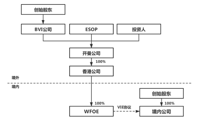 本文僅從已經信息公開的境外上市案例角度出發,分析、總結投資者完成投資VIE架構,企業的常見投資架構如下:
