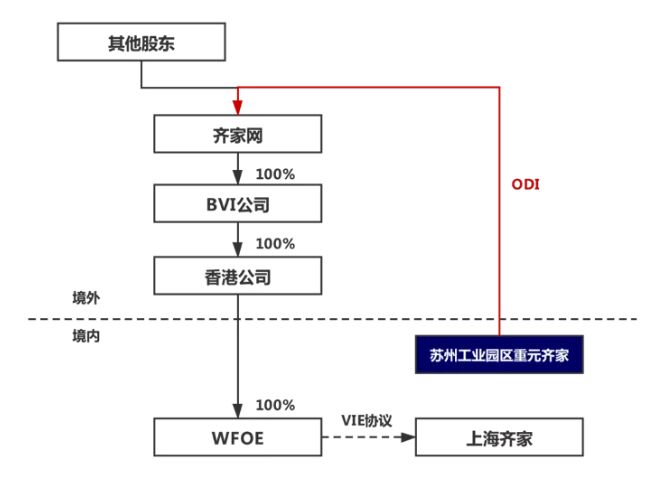 在近期赴港完成上市的新經濟企業中,Qeeka Home(Cayman)Inc.(簡稱“齊家網”)的部分境內機構投資者系采用了境內不持股VIE公司+境外直接持股的方案,具體情況如下: