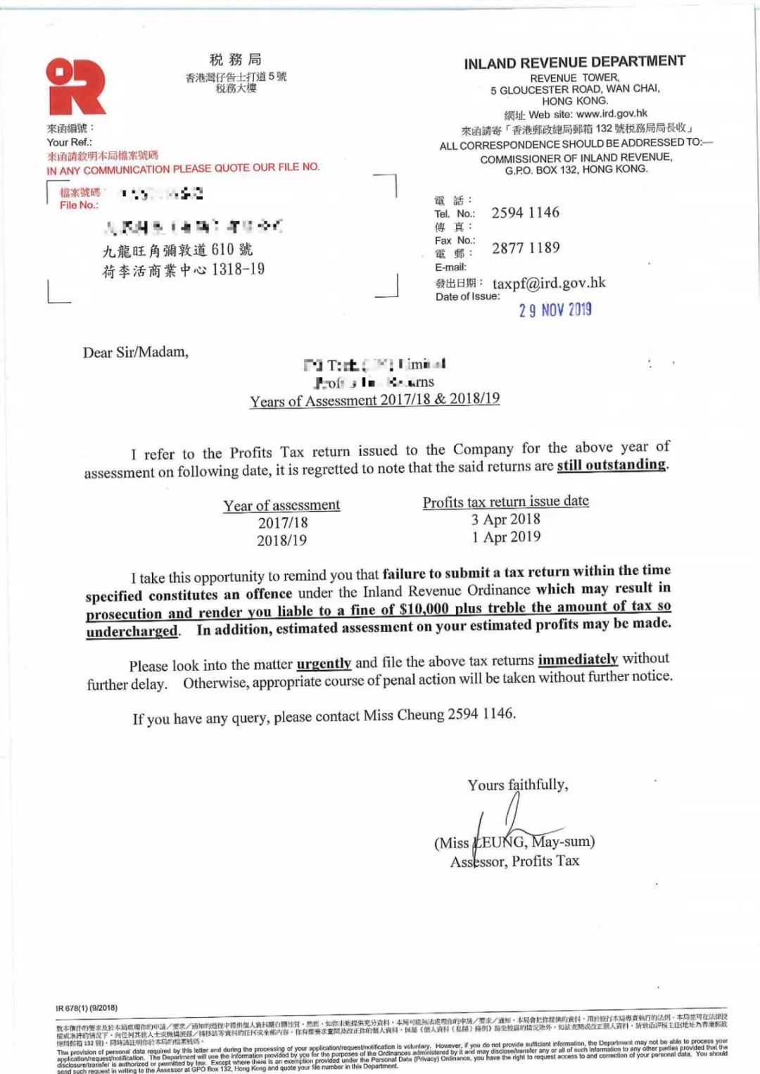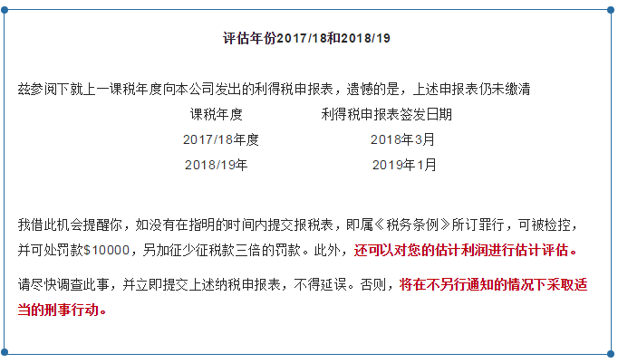 同時,截止12月尚未申報的公司,香港稅局也陸續開始下發通牒信函(如圖所示),公司將可能面臨高額罰款及評稅,且進行強制扣稅!